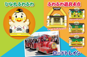ファミリーゾーンでは、中に入って遊べる「ふわふわひな丸くん」や、スピードチャレンジやバッティングチャレンジなどのエアー遊具がお楽しみいただけます。ファミリーゾーンのまわりは、ロードトレインを運行します