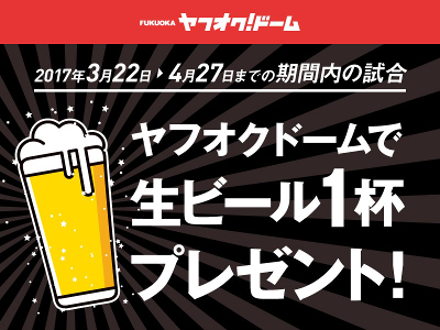 福岡ソフトバンクホークスが主催するオープン戦・公式戦のうち、福岡ヤフオク!ドームにて開催される試合日は、スポナビライブ会員であればヤフオクドーム内にて生ビールを1杯プレゼントいたします!