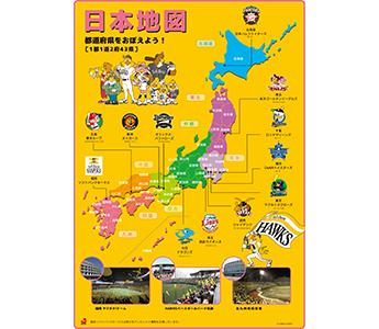 うら面は、学習に役立つ日本地図に、プロ野球12球団の所在地と、ホークス関連施設の所在地を紹介し、楽しく勉強できるデザインにしました。