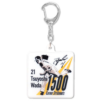 和田投手の投球シーンとサイン、1500奪三振を表す「1500CAREER STRIKE OUTS.」をデザインしたアクリル製の記念キーホルダーです。このキーホルダーをバッグや小物につけて和田投手を応援しよう!