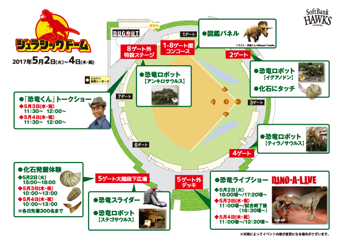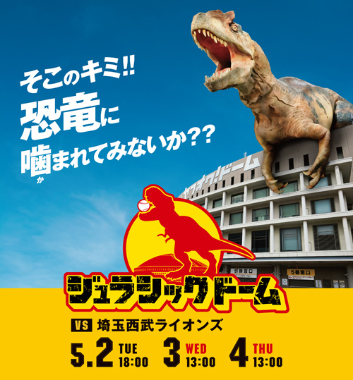 ゴールデンウィークの5/2(火)~4(木・祝)に行われる、埼玉西武戦3連戦で、GW特別企画・「ジュラシックドーム」を開催!ヤフオクドームが恐竜一色になります!