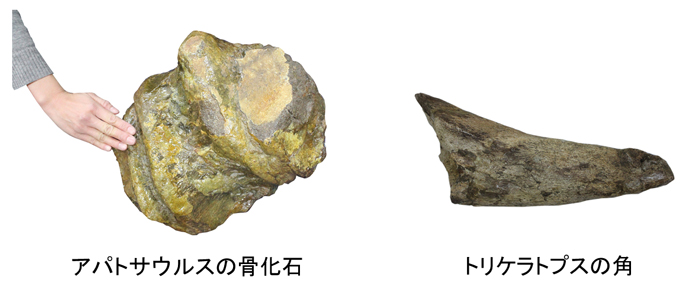 アパトサウルスの骨化石やトリケラトプスの角など本物の化石に手で触れることができます。化石に触れて、恐竜たちの不思議を感じてみよう!