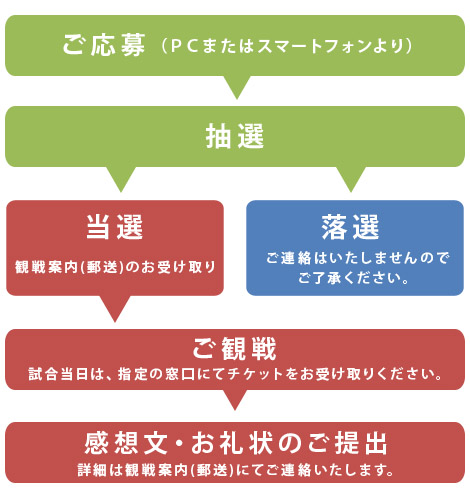 | 試合日 | 対戦 | 試合開始 | 応募締切 | 当落通知 |