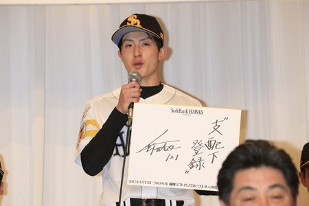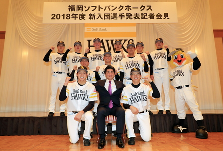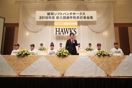 12月7日(木)、今年度のドラフト会議で指名され、2018年度よりホークスに加わる11名の新入団選手(支配下選手5名、育成選手6名)の入団発表が福岡市内のホテルで行われました。新たに加わる頼もしい若鷹たちが誕生に、同席した工藤公康監督も「今年はキャラが濃いね」と笑顔を浮かべていました。