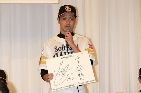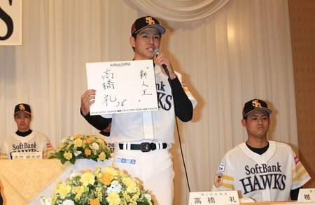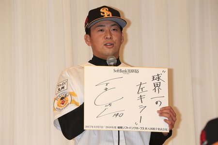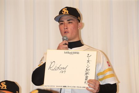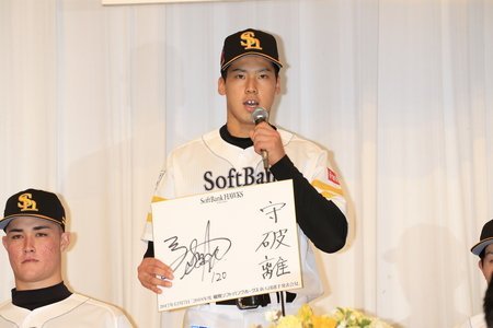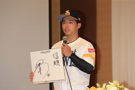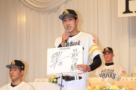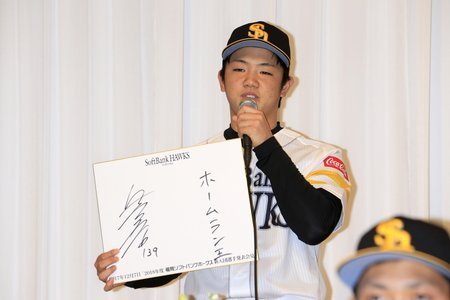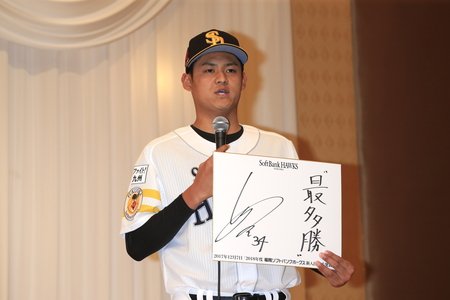最速151キロを誇る将来有望の右腕は「しっかり体を鍛えて1年目から155キロ、そしていつかは160キロを出したい」と夢を語っています。「強いチームでやらせてもらう覚悟も持って臨みたい。ストレートも変化球も自分の投げっぷりの良さを見ていただきたいです。対戦したい打者は、同じパ・リーグに入団した清宮選手(ファイターズ)、安田選手(マリーンズ)。ストレートで三振を取りたいです」と凛々しい表情で話しました。目標は千賀投手。そして背番号26は、かつてダイエー時代に松中信彦選手、南海時代には新人王に輝いた藤田学投手もつけた“出世番号”と言われています。「いい番号を頂いたので、恥じないように頑張りたい」と気持ちを高ぶらせ、将来の目標に「最多勝」を掲げました。