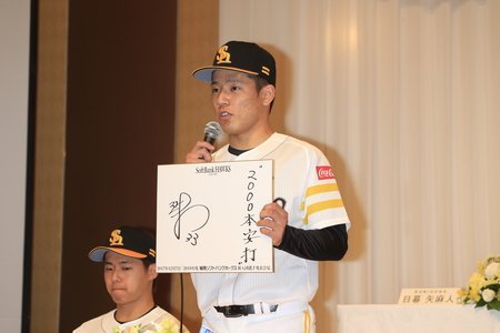 強豪の横浜高校で主軸を打ち、今夏の神奈川大会では大会新の4試合連続本塁打を放って注目を集めました。しかし、増田選手は「自分は中距離砲をめざし、打率にこだわりたい。そして勝負強さです」と自己アピールしました。また、長崎出身で「九州で野球が出来るのが嬉しい」と笑顔になり、「松田選手のような熱い男になりたい。持ち味は声と元気。しっかりチームを盛り上げられる選手になりたいです。10年後には誰からも頼られるリーダーに。そして『熱男』になるので、応援よろしくお願いします!」と元気いっぱいでした。