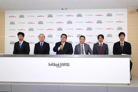 同日、ヤフオクドーム内のプレスカンファレンスルームで発表会見が行われ、ホークスからは太田宏昭代表取締役専務、舘賢治NPO法人ホークスジュニアアカデミー理事長、ホークスOBで現在スポーツ振興部の新垣渚氏が出席。リーフラス株式会社の伊藤清隆社長、同社で講師を務めるホークスOB本間満氏も登壇しました。