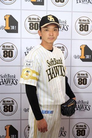 会見には専用ユニフォームと専用キャップも装着して登場した東浜投手。