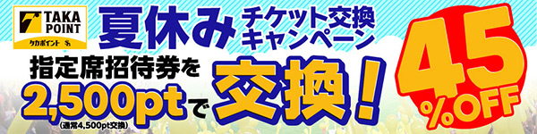 タカポイント交換では、8月14日(火)~16日(木)を対象とした、夏休みチケット交換キャンペーンも実施中!ポイントを利用して、お得に野球観戦をしよう♪