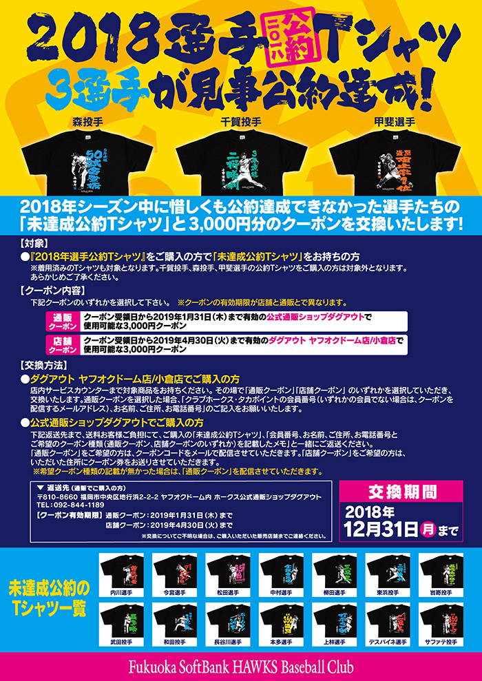選手公約Tシャツにプリントされた公約を達成できなかった選手のTシャツをお持ちの方は、お手持ちのTシャツと引き換えにオフィシャルグッズショップ ダグアウトでご利用いただける3,000円分のクーポンと交換致します。