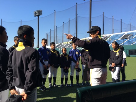 就任2年目の新垣渚監督は「飛び抜けた存在の選手はいないけど、チームとしてすごくまとまりを感じます」と言います。ここまでの練習試合は快調。大阪に遠征してタイガースJr.、バファローズJr.を相手にも勝利をおさめ、昨年度からさらなるレベル向上を求めて中学生チームに胸を借りて行う練習試合でも勝利しました。
