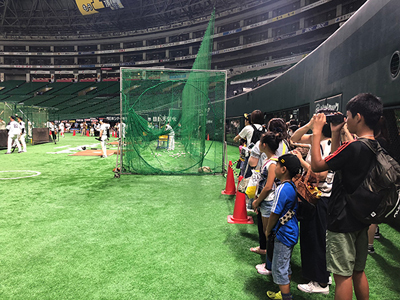バックネット裏の〈みずほ〉プレミアムシートに座り、ホークスOBによる“選手たちの練習方法”や“試合の見所”についての解説を聞きながら、試合開始前の練習風景を見学!