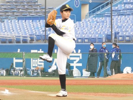 先発した左腕の三渡琢磨選手は3回1失点。2番手には女子選手の橋本輝桜選手がマウンドに上がり、相手3番からの好打順を3人で仕留めた。3番手の大城諄來選手は120キロ台中盤の速球を軸に2回1失点でつなぐと、六回裏に代打・仲間夢折選手の適時打で追加点を挙げた。