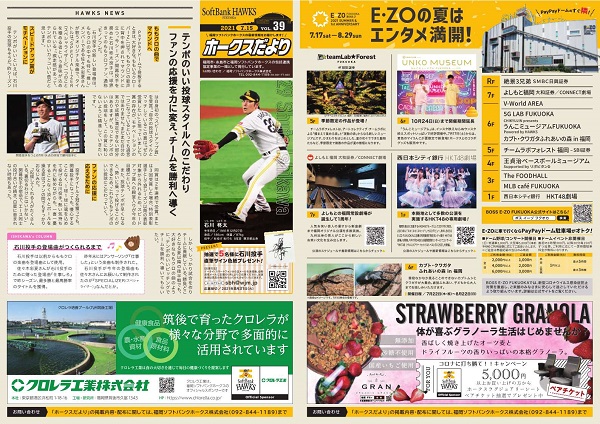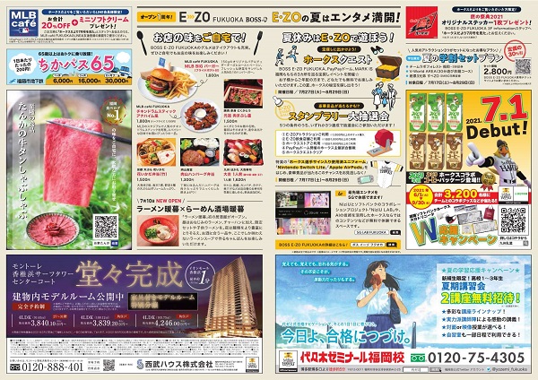 7月号の福岡市・糸島市版は、開業1周年を迎える「BOSS E・ZO FUKUOKA」を特集。ホークスだよりをご覧いただいた方だけのお得な特典や夏休みイベント情報など、通常より紙面を拡大してお届けします。