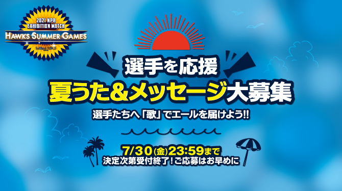 あなたが「選手たちに届けたい曲」と、その曲にまつわるエピソード、メッセージを大募集します!採用された方は、エキシビションマッチ期間中にホークスビジョンで応募いただいた「夏うたリクエスト&メッセージ」を掲出!