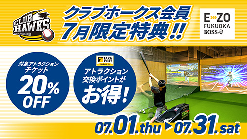 7月1日(木)~31日(土)はクラブホークス会員限定でBOSS E・ZO FUKUOKAのアトラクションがお得!E・ZOに行ったことがある人も、まだ行ったことがない人も、この機会にぜひいろんなアトラクションをお楽しみください!
