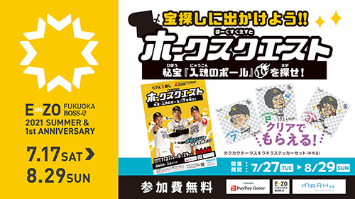7月27日(火)~8月29日(日)の期間、BOSS E・ZO FUKUOKA、福岡PayPayドーム、MARK IS 福岡ももちの3か所を巡る宝探しイベントを開催!隠された謎を解き隠された宝物を見つけよう!見事に宝物を発見したトレジャーハンターにはクリア賞として「カクカクホークス キラキラステッカーセット(非売品)」をプレゼントします!詳細はエキシビションマッチ入場時にお渡しする冊子をご確認ください。