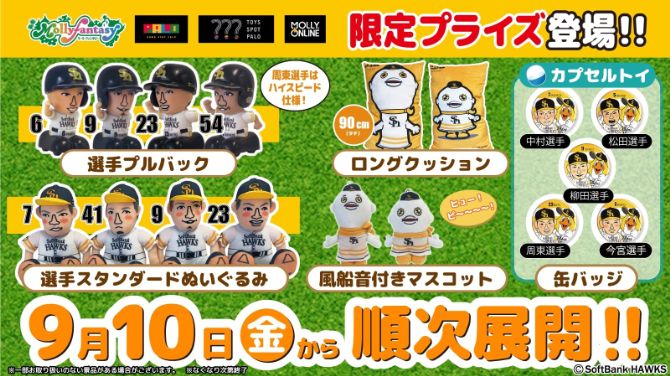 福岡ソフトバンクホークス監修グッズがアミューズメント施設「モーリーファンタジー」「PALO」の一部の店舗と、オンラインクレーンゲーム「モーリーオンライン」限定のプライズや、上記の店舗に加えてカプセルトイ専門店「TOYS SPOT PALO」限定のカプセルトイとして9月10日(金)から順次登場いたします!