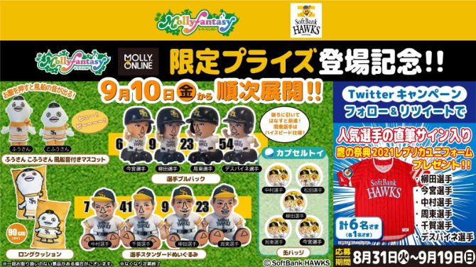 福岡ソフトバンクホークス監修グッズがアミューズメント施設「モーリーファンタジー」「PALO」の一部の店舗と、オンラインクレーンゲーム「モーリーオンライン」限定のプライズや、上記の店舗に加えてカプセルトイ専門店「TOYS SPOT PALO」限定のカプセルトイとして9月10日(金)から順次登場いたします!人気選手や球団キャラクター「ふうさん」「こふうさん」のプライズが4アイテム、カプセルトイ1アイテム登場するので ぜひGETしてください♪