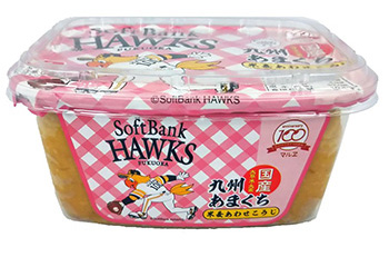 「九州あまくち米麦あわせこうじ500g」は球団マスコットのハリー・ホークが描かれており、主原料は全て国産原料を使用した甘口の米麦合わせ味噌となります。