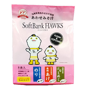 「九州米麦あわせみそ使用あわせみそ汁8食」は球団キャラクターの「ふうさん」、「こふうさん」を起用!こだわりの具材は「熊本 県の南関あげ」・「佐賀県の有明海産のり」・「福岡県ぶなしめじ」を使用したインスタント味噌汁になります。