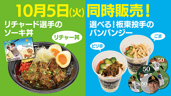10月5日(火)からリチャード選手のソーキ丼「リチャー丼」と「選べる!板東投手のバンバンジー」を販売いたします!それぞれご購入の方にはオリジナルステッカーをプレゼント♪