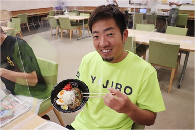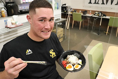 2ゲート 『肉山』福岡・BOSS E・ZO FUKUOKA内 肉山食堂にてリチャード選手のソーキ丼「リチャー丼」を販売いたします。リチャード選手の出身地である沖縄を代表するお酒「泡盛」などでじっくり煮込んだソーキ使用した丼ぶりです。リチャード選手はもちろん他の選手からもご好評を頂きました!