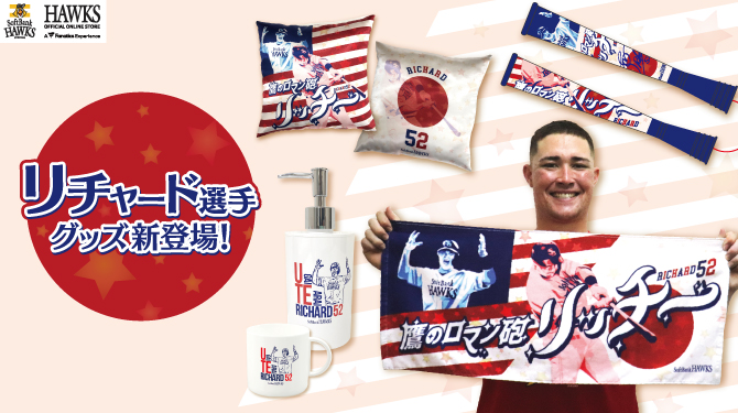 リチャード選手監修デザインのグッズが新登場!アメリカと日本の国旗を背景に愛称の“リッチー”をデザインしたグッズや、初めてのお立ち台で球場を沸かせた「手洗い、うがい、リチャード」にちなんだグッズなどがラインナップ!また、今なら松田選手が記録達成時に掲げた直筆サイン入り通算300本塁打記念達成パネルが当たるキャンペーンを実施中です。その他にも新商品やお得なキャンペーンも続々登場しているので、お見逃しなく!