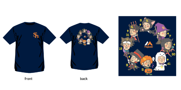 ハロウィンの仮装をしたカクカクホークス選手キャラクターのTシャツが新登場!