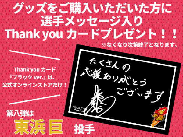 グッズご購入のお客様へ、選手直筆のThank youカード(レプリカ)を1枚プレゼント中!東浜投手からファンの皆様へメッセージをお届けます。