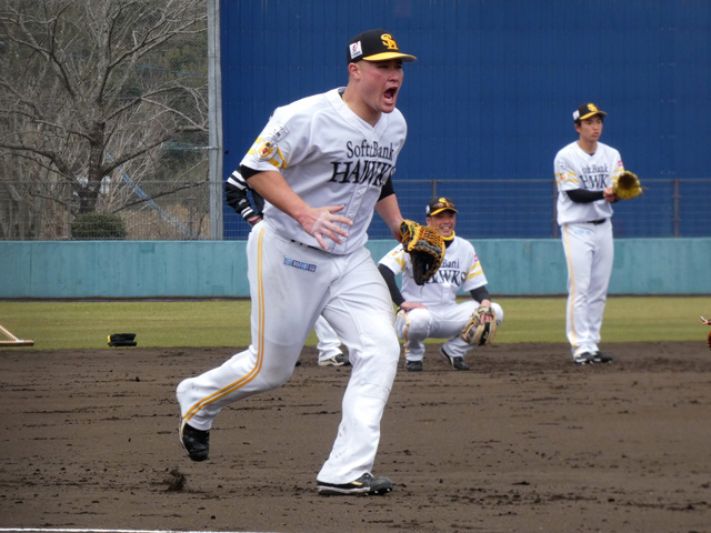 また、B組にはリチャード選手が筑後C組から合流。元気な声で朝から猛アピールし、「通常フリー打撃が良くなかったんで、お願いして入れてもらいました」と居残り特打にも参加してバットを振り込みました。小久保裕紀二軍監督が打撃投手を務める中、20分間で25発のサク越えがノルマでしたが、途中から10本追加となり、20分35発を見事にクリアしていました。