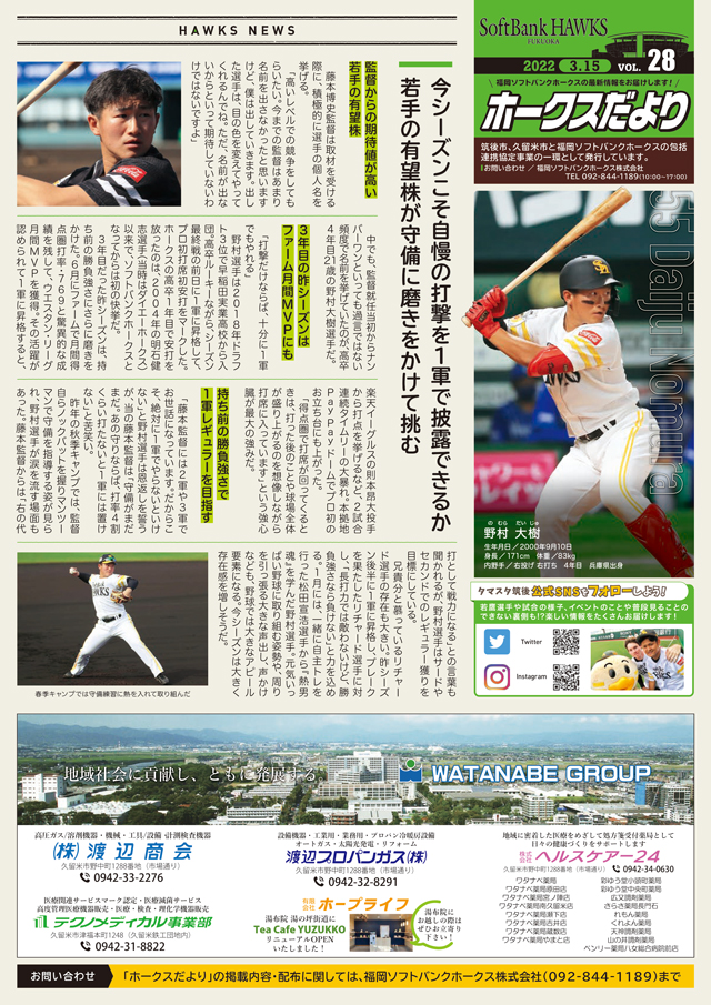 3月号の福岡市・糸島市版は、3月25日(金)から始まる公式戦にむけ、藤本監督率いる新生ホークスの開幕特集を掲載。PayPayドームで楽しむためのグルメ・グッズ情報から、イベント情報まで、通常より紙面を拡大してお届けします。選手面には、今シーズンからキャプテンに就任した柳田選手について取り上げます。