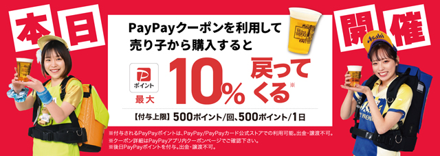 6月17(金)は売り子からPayPayクーポンを利用して商品を購入すると、お得になるキャンペーンを実施します!PayPayアプリ内で対象クーポンを獲得し、PayPay決済をご利用いただくと、PayPayポイントが最大10%戻って来ます!売り子販売のビールやチューハイ、アイスクリームなどご購入金額に応じて後日PayPayポイントが付与されます!