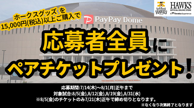 期間中に、HAWKS STORE HOMEおよびHAWKS公式オンラインストアにて、グッズを税込15,000円以上ご購入の方先着2,000組/4,000名様に、外野席ペアチケットをプレゼントいたします!