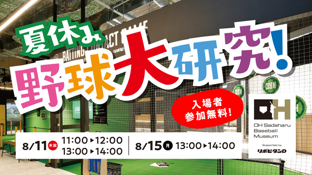8月11日(木・祝)・15日(月)の2日間限定で、ホークスOB講師による野球講座「夏休み 野球大研究!」を開催します。野球の基本や選手の動きをホークスジュニアアカデミー講師に教えてもらえる絶好の機会!夏休みの思い出づくりはもちろん、自由研究にもおすすめです!夏休みはみんなで王貞治ベースボールミュージアムへ行こう♪
