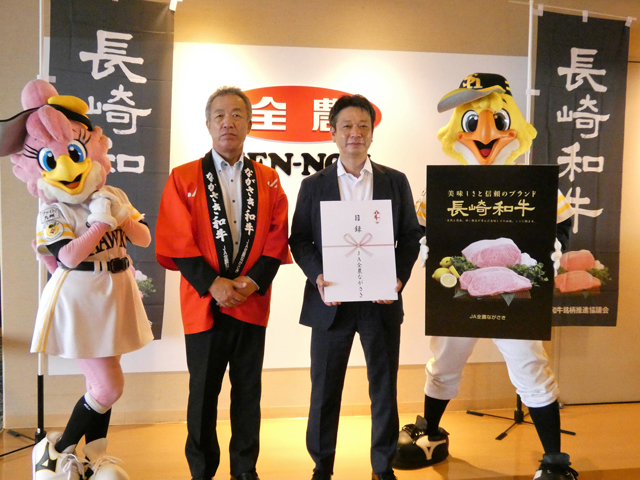 贈呈者の全国農業協同組合連合会・長崎県本部・副本部長の木下満夫様より球団を代表して事業統括本部・営業本部の新井仁本部長が目録とパネルを受け取りました。長崎和牛は、肉本来の旨みを持つ赤身とまろやかな味わいの脂身のバランスが絶妙です。チームに贈呈いただいた「長崎和牛」は後日、選手サロンにて提供され、リーグ優勝と日本一を目指すホークスナインの活力の源となります。