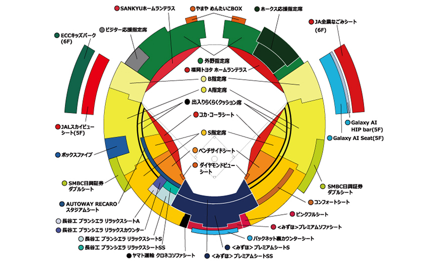 - ※4 ホークス応援席、ビジター応援席では相手チームの応援はできません。相手チームの応援グッズ(ユニフォームなど)の着用・お持ち込みもお断りいたします。また各チームの攻撃時には立って応援する方が多数おられます。また外野席では応援団が鳴り物(太鼓)による応援を行いますので、あらかじめご了承のうえチケットをご購入ください。