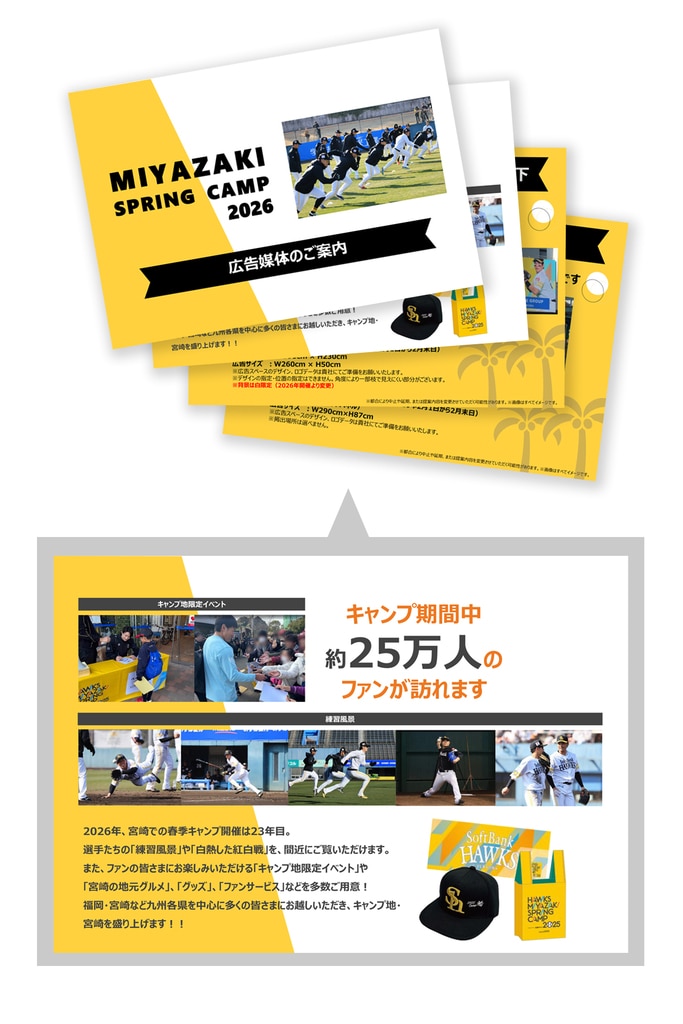 貴社商材をPRできる「ホークス宮崎春季キャンプ」の広告媒体や協賛メニューについて紹介しています。下記に当てはまる方は、こちらより資料をダウンロードください。