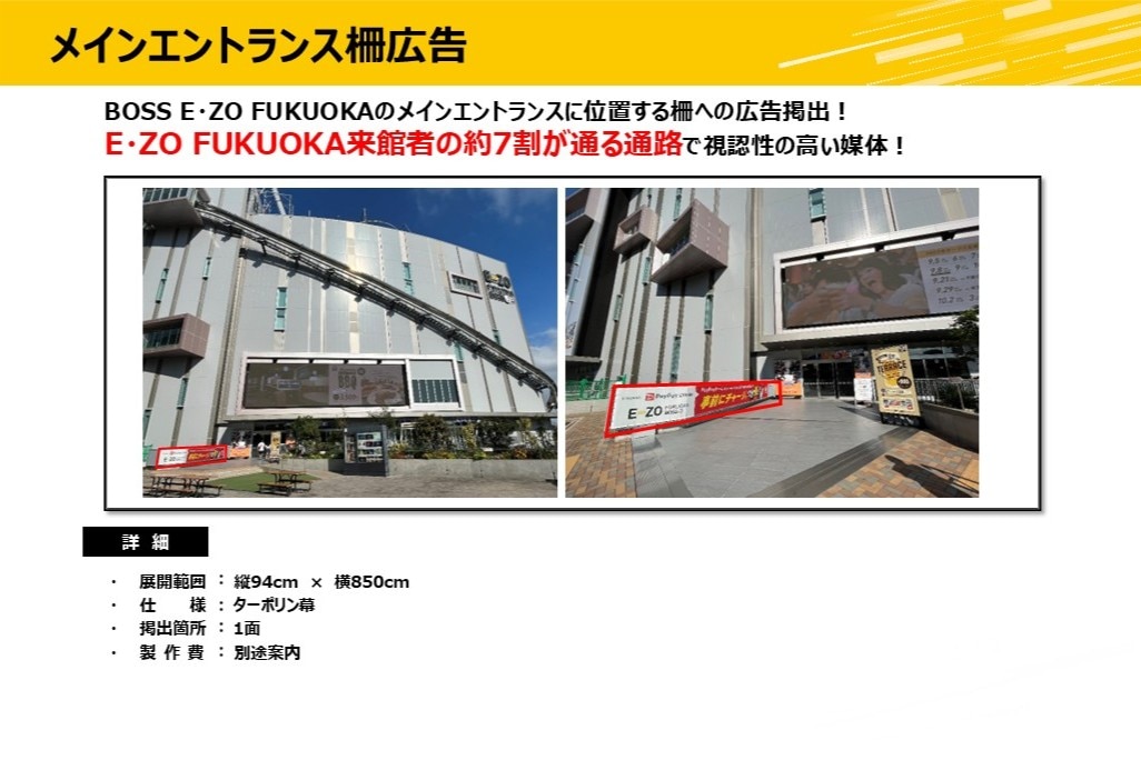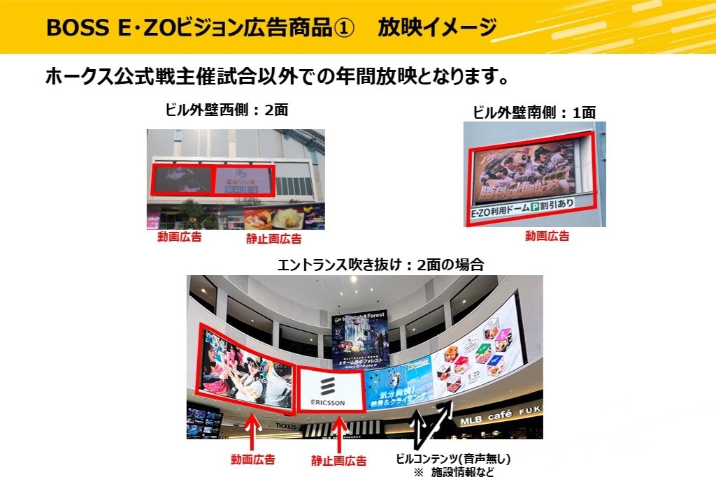 みずほPayPayドームに隣接する複合エンターテインメント施設「BOSS E・ZO FUKUOKA(ボス イーゾ フクオカ)」の広告媒体やネーミングライツ、アトラクション回数券などを紹介しています。下記に当てはまる方は、こちらより資料をダウンロードください。