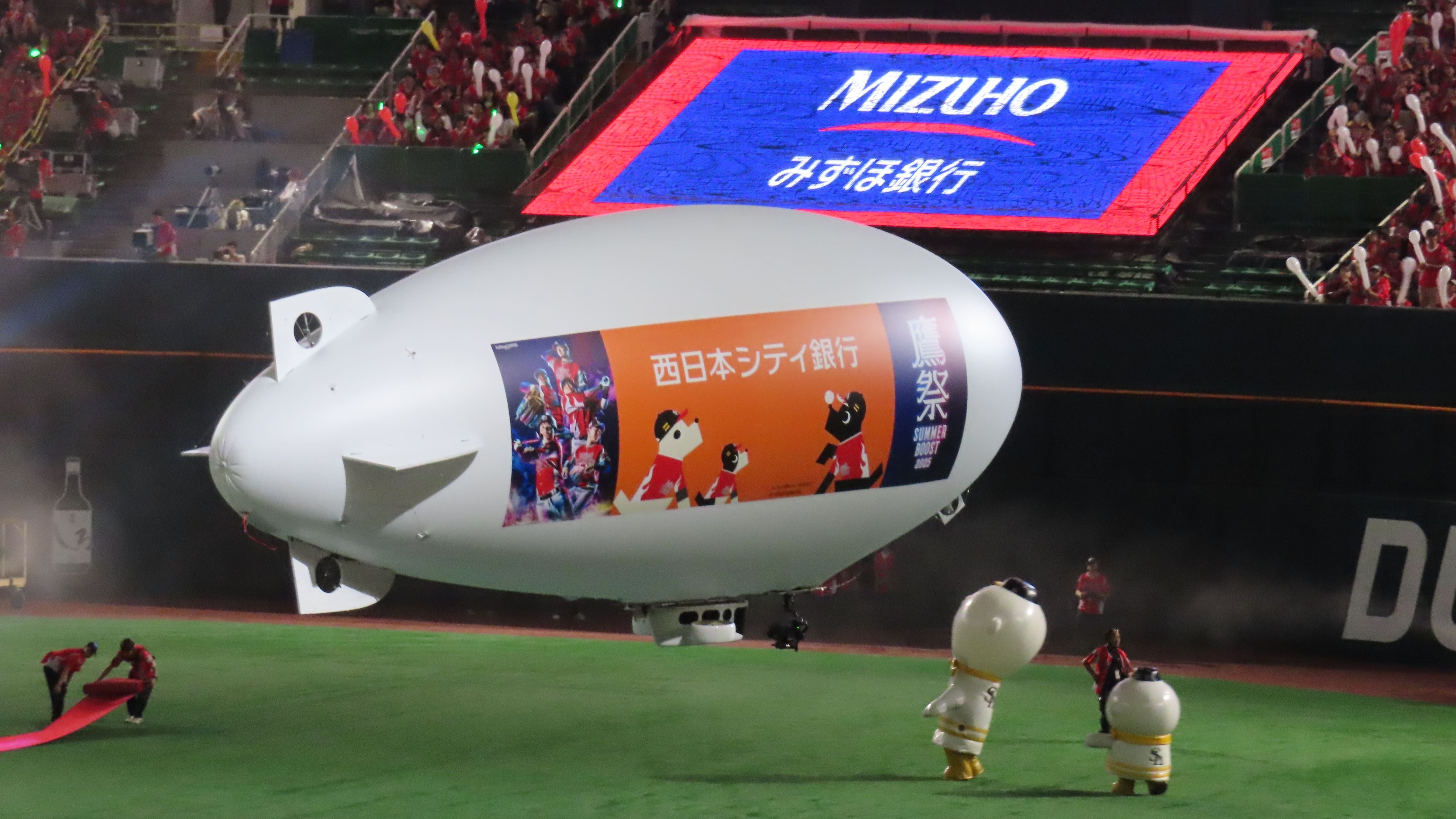 試合前/試合中/試合終了後に旋回する飛行船へ、貴社ロゴを掲出いたします。来場者の視線を一身に集める、広告メニューです。
