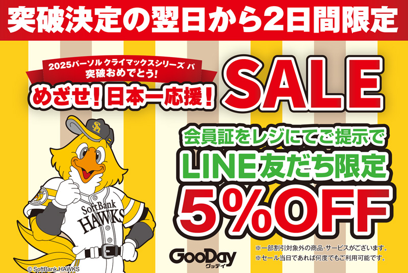 | 内容 | LINE友だち限定 5%OFF(一部割引対象外の商品・サービスあり) |