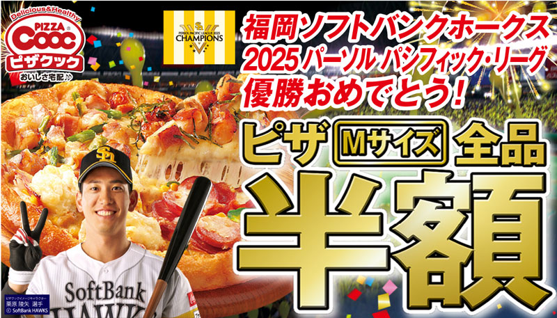 | 内容 | ピザMサイズ全品を半額でご購入いただけます! ※半額キャンペーンの配達は税込み1620円以上より承っております。 ※半額キャンペーンのハーフ&ハーフは承っておりません。 ※半額キャンペーンのご注文はピザクックHPからのみとなりお電話では受付できません。(クーポンをお持ちの方を除く) |