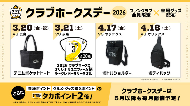 当日はご来場や飲食・グッズの購入タカポイント2倍や、「クラブホークスオリジナルユニフォーム2026」を着用者限定グッズをお渡しを行います。