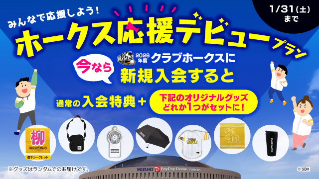 通常の入会特典に加えて、クラブホークス会員しか手に入らないオリジナルグッズがセットになりました。ぜひクラブホークスの一員として、2026年もホークスと熱く盛りあがりましょう!