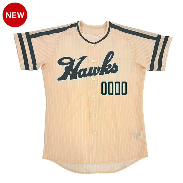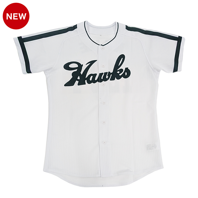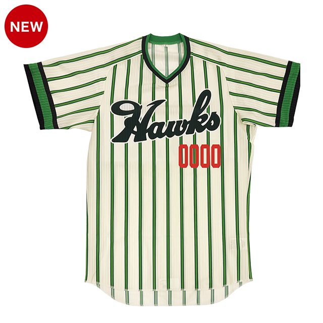 双肩・袖口・パンツに入った2本の力強い南海グリーンのラインやHawksマークの左下に入れられた「胸番号」が印象的なデザイン。