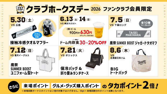 クラブホークスデー当日、みずほPayPayドームへの来場でもらえるタカポイントが2倍の100ptになります。