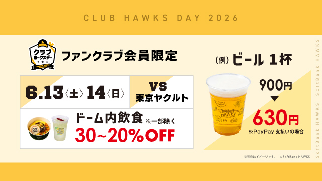 ※モバイルオーダー、ドーム外周店舗(ケンタッキーフライドチキン、ピザクック、とりかわ竹乃屋 鷹正、HUB)、鷹マルシェ(キッチンカー)、FAN'S SQUARE、The FOODHALL、ビクトリーウイング、スーパーボックスは割引対象外となります