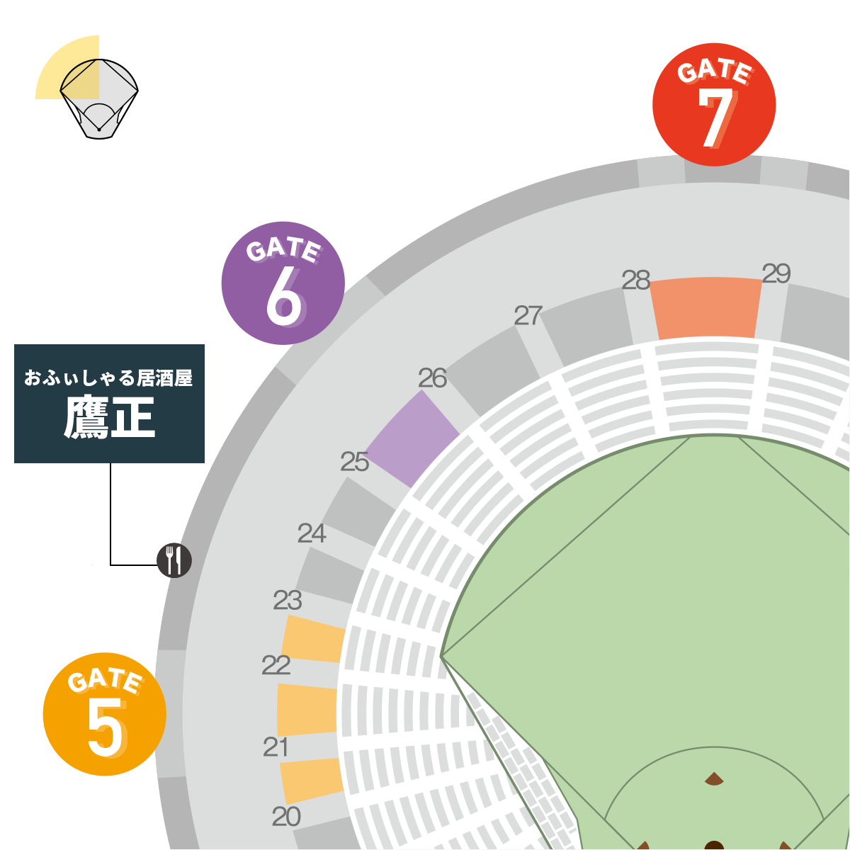 7回終了時よりコンコース24通路を通り抜け、スタンド最上段へ上がると鷹正専用入口があります。