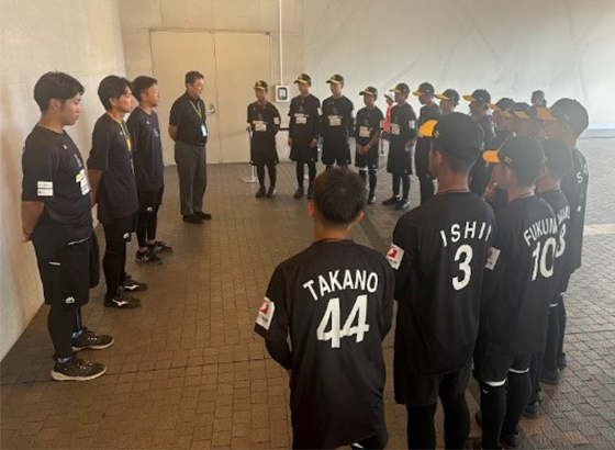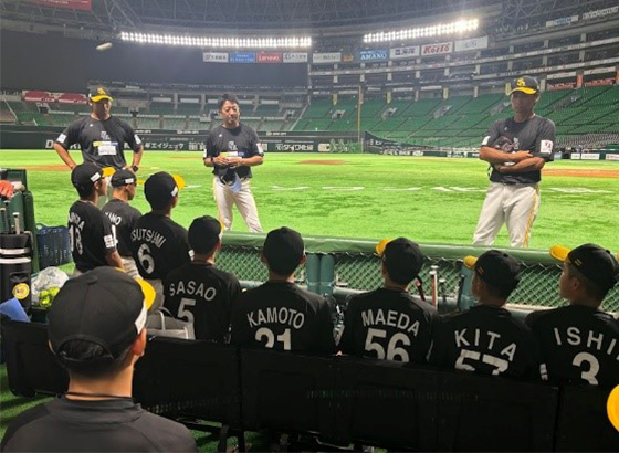 午前中はドーム内の打撃ゲージを使用してバッティングを中心とした技術練習を、午後からは中学軟式クラブチームとの練習試合と、濃密な2日間となりました。また、練習の合間には三笠取締役GM 球団統括本部長が激励に訪れ、大会に向けて選手たちへメッセージを送りました。