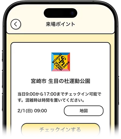 宮崎または筑後のキャンプ地でチェックインすると、50ptもらえる!